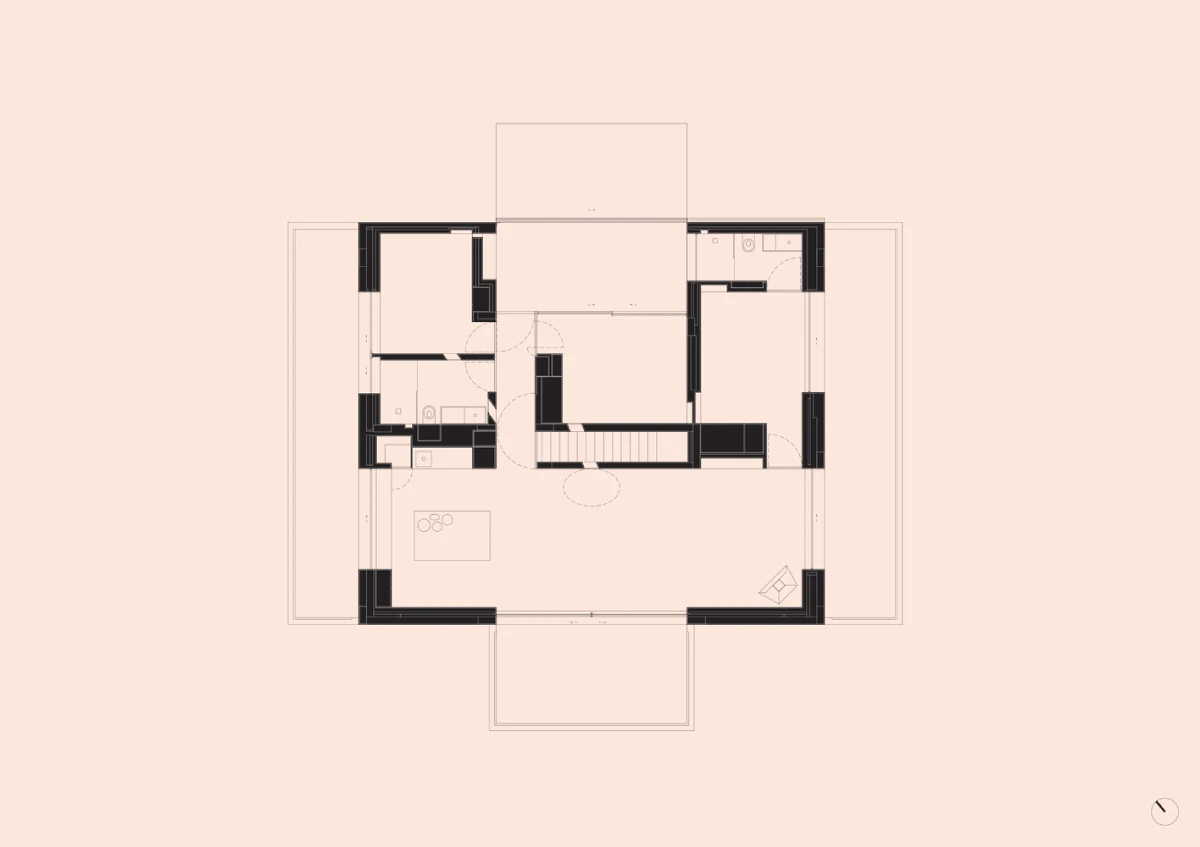 خانه در یک طبقه سازماندهی شده است؛ آشپزخانه، ناهارخوری و نشیمن در یک فضای بزرگ مشترک قرار دارند که به طور متقارن به سمت شمال، شرق و غرب باز میشود، در حالی که سه اتاق خواب رو به جنوب هستند.