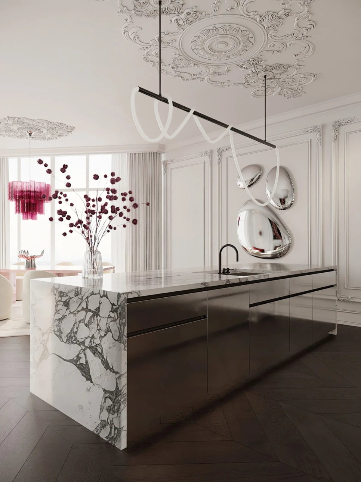 آشپزخانه با یک جزیره مرمری چشمنواز که سطح رگهدار آن به طور یکپارچه تا دیواره پشت کابینتها (backsplash) امتداد یافته، فضایی مستحکم پیدا کرده است.