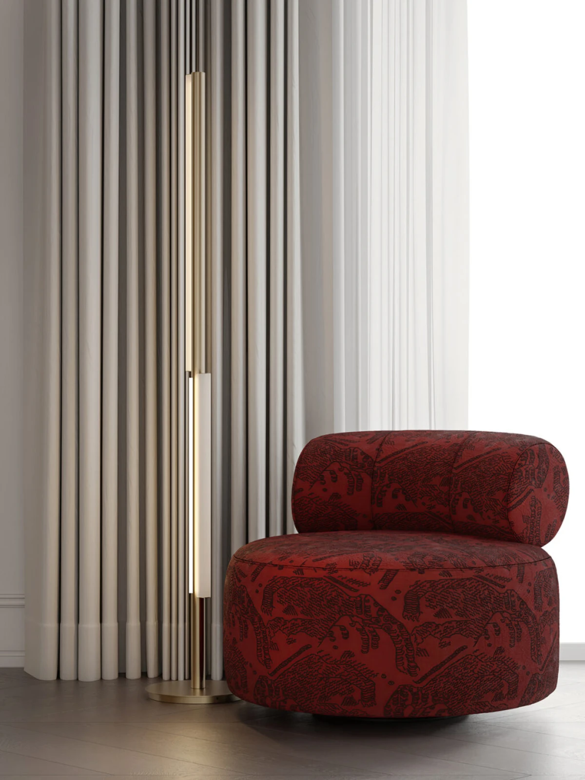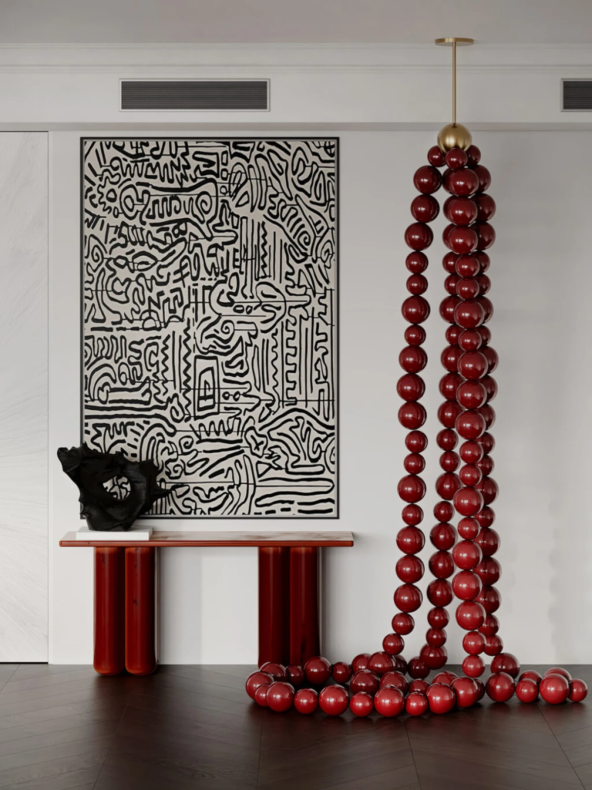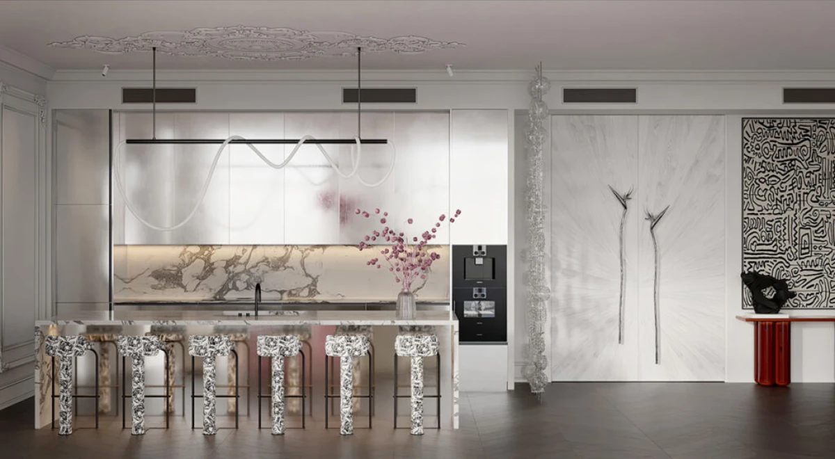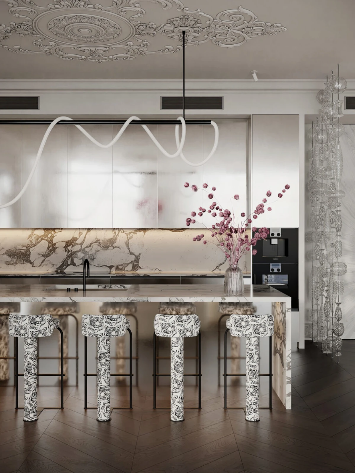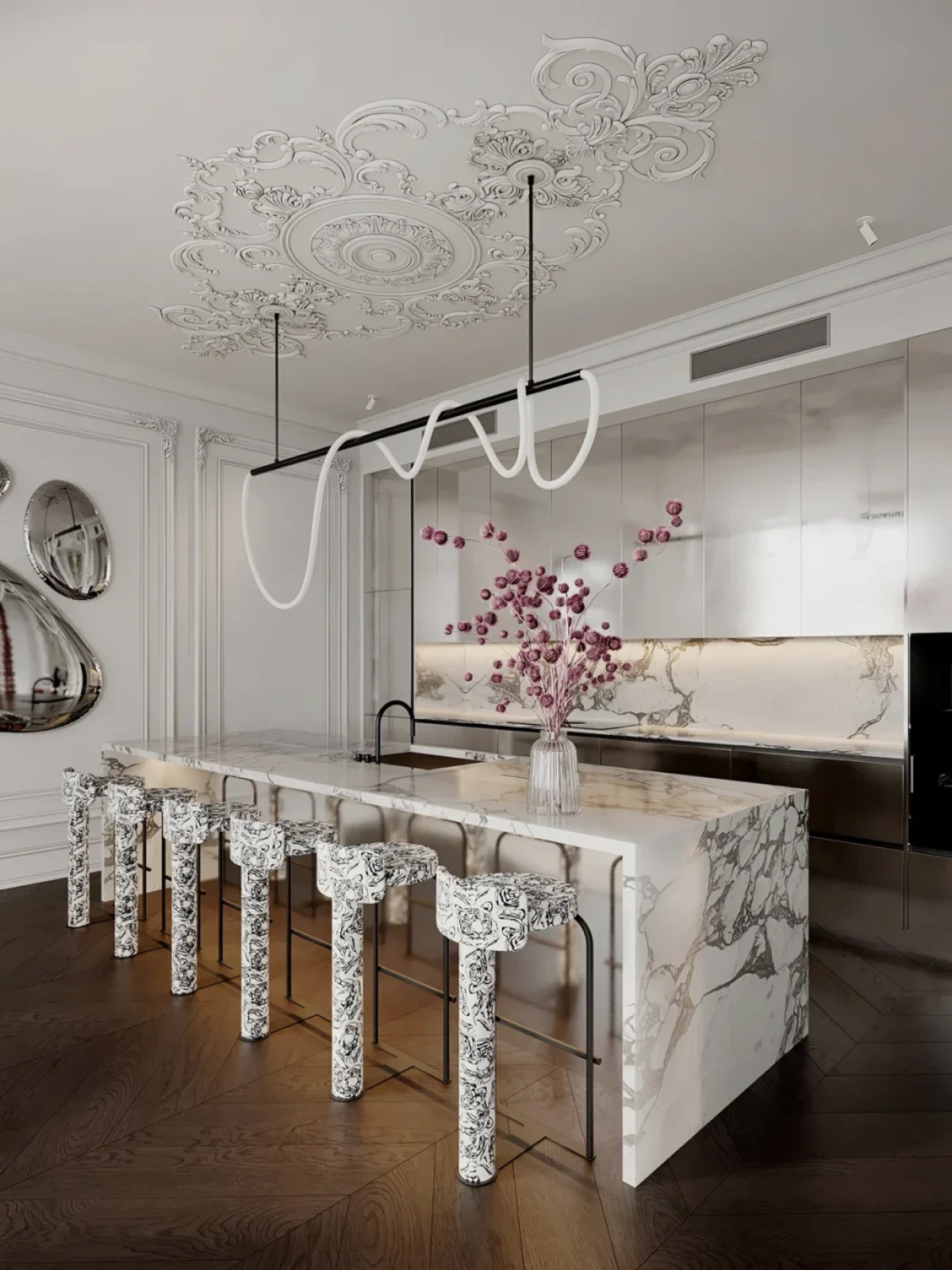 صندلیهای اپن مجسمهمانند که با طرحهای پیچیده سیاه و سفید پوشانده شدهاند، از یک ابزار کاربردی به قطعات هنری تبدیل شدهاند. در بالای سر، یک چراغ آویز نواری شکل و سیال، از میان طرحهای دایرهای و پرکار سقف (ceiling medallions) عبور میکند.
