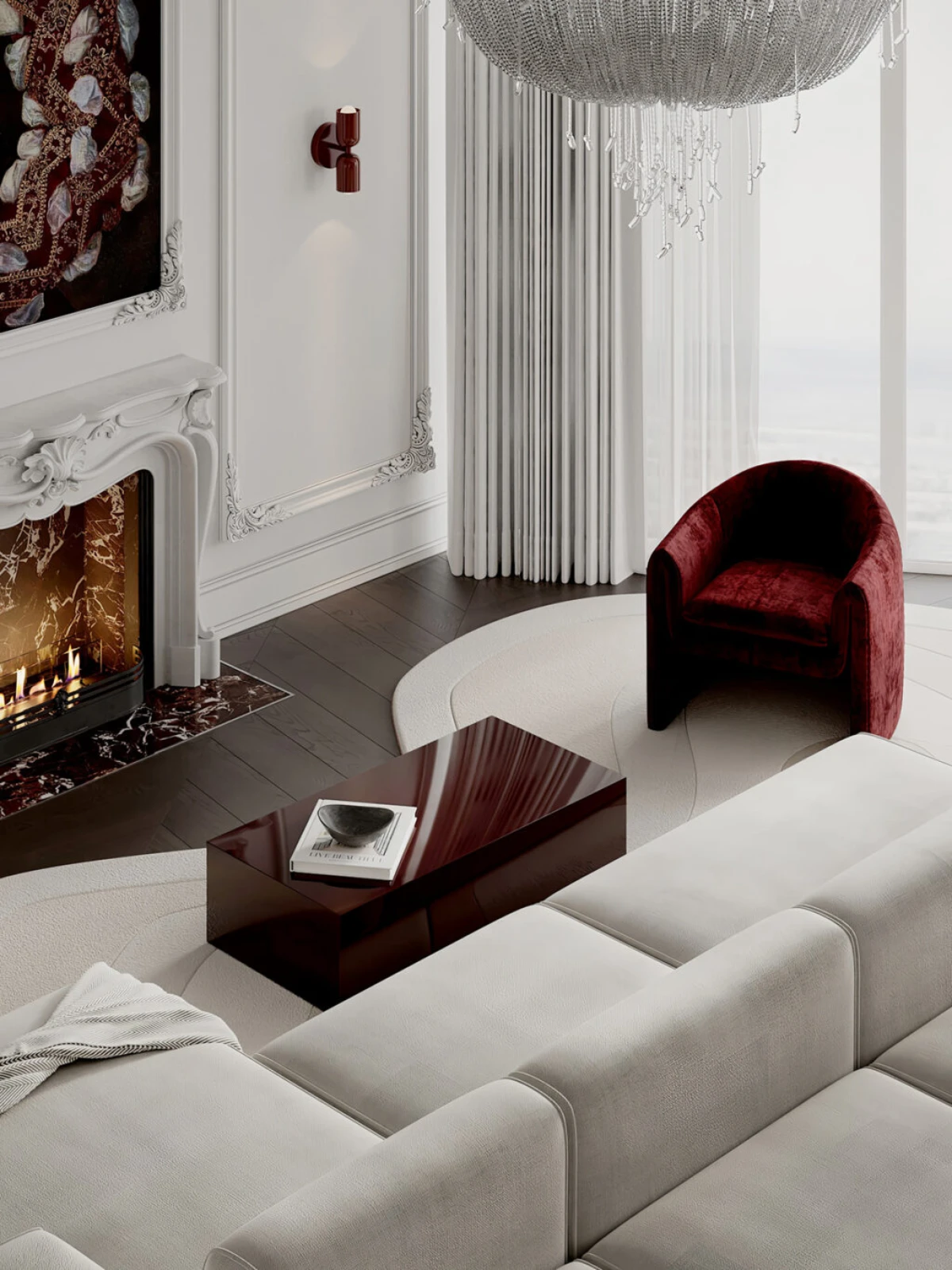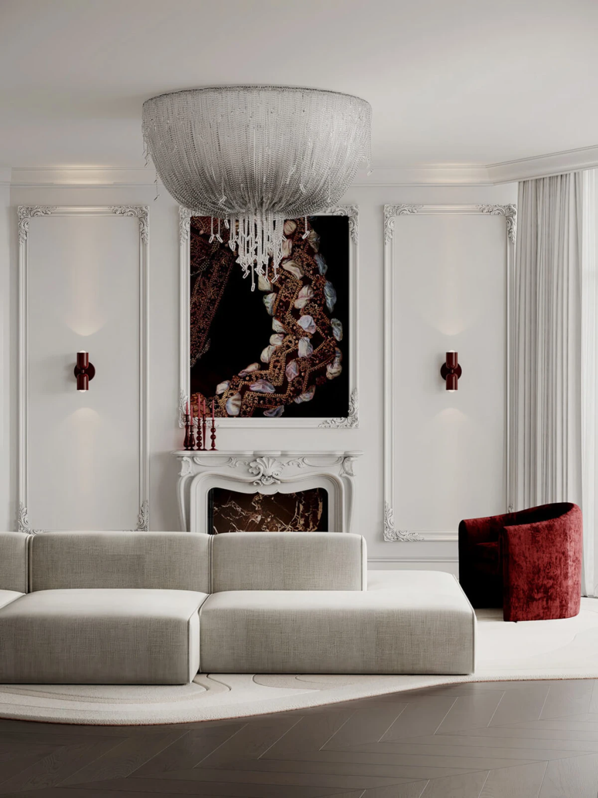 فضای نشیمن با یک مبل سکشنال (چند تکه) مجسمهگونه و کوتاه، به رنگ بژ ملایم، حالتی محکم و باثبات پیدا کرده است. سادگی خطوط هندسی این مبل، در تضاد زیبایی با شومینه سفید پرکار قرار دارد که با کندهکاریهای ظریف و یک بخش مرمری عمیق، جلوهای ویژه پیدا کرده است. بالای شومینه، یک اثر هنری جسورانه که با حاشیهبندیهای کلاسیک دیوار قاب گرفته شده، یک نقطه کانونی چشمنواز و دراماتیک را ایجاد میکند. در عین حال، جزئیات زرشکی تیره – از جمله صندلی مخملی و میز براق قهوهخوری – به پالت رنگی روشن فضا، غنا و عمق میبخشند. لوستر بالای سر نیز به خودی خود یک اثر هنری است که با زنجیرهای ظریف و آبشاری خود، در مقابل نور طبیعی که از پنجرههای بلند تا سقف به داخل میتابد، به آرامی میدرخشد.