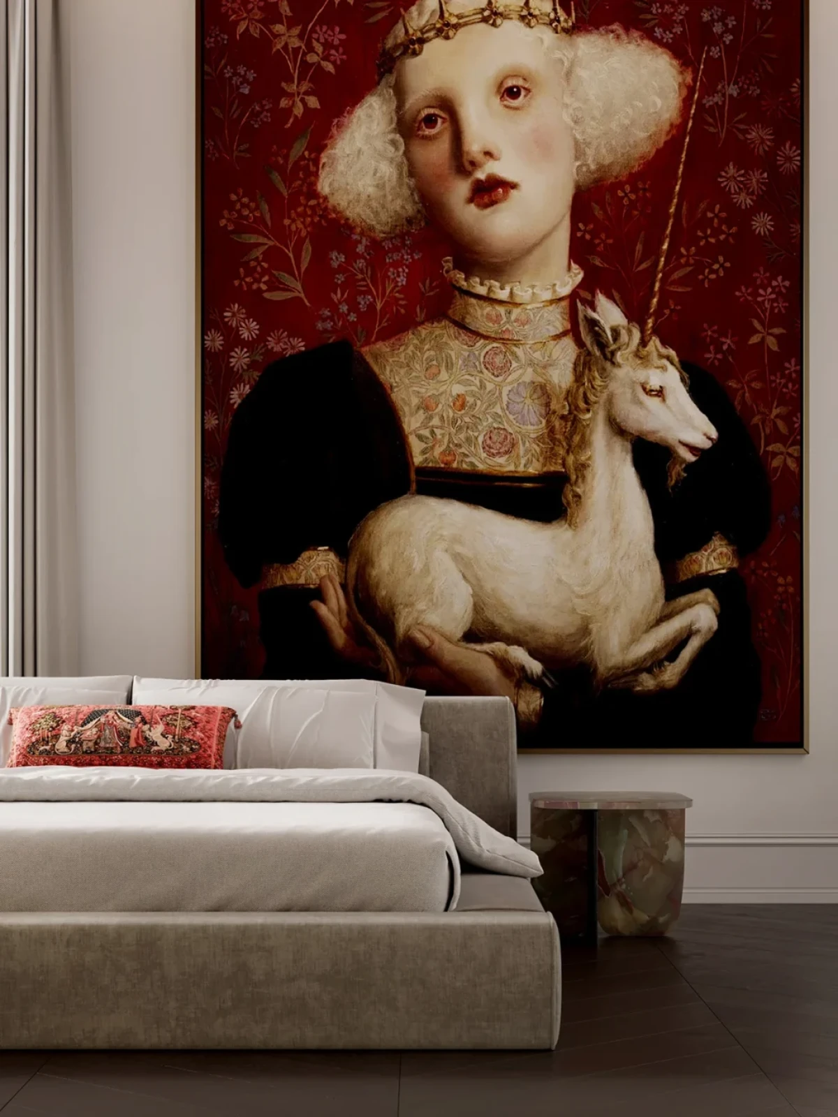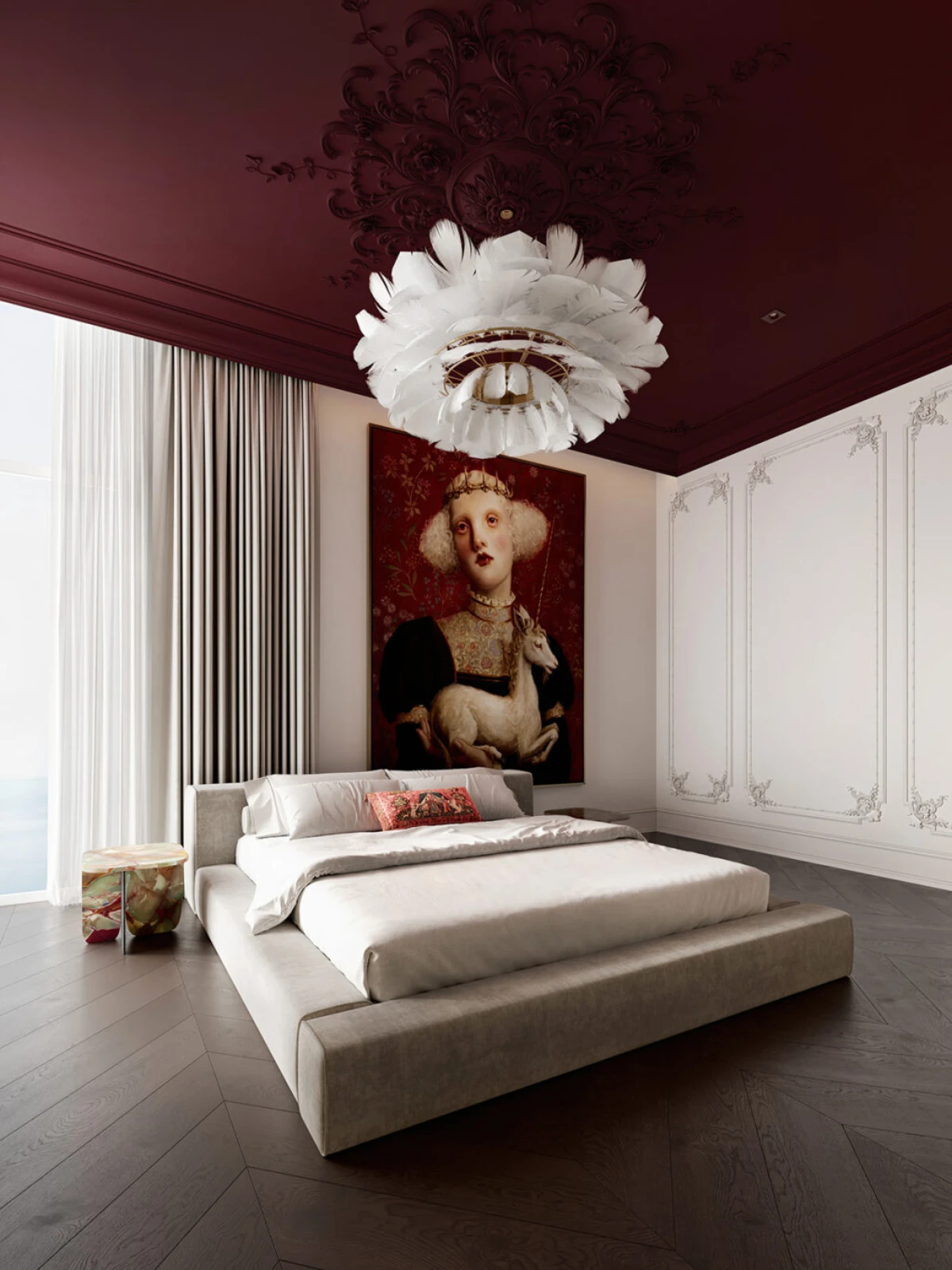 اتاق خواب، خلوتگاهی دراماتیک و در عین حال آرام است. سقفهای آن با رنگ زرشکی تیره و جزئیات پرکار و یک لوستر پردار برجسته، فضایی چشمنواز ایجاد کردهاند. یک تابلوی نقاشی خیرهکننده به عنوان نقطه کانونی هنری عمل میکند و در مقابل، منسوجات نرم و یک تخت کوتاه، ثبات و آرامش را به فضا میبخشند.