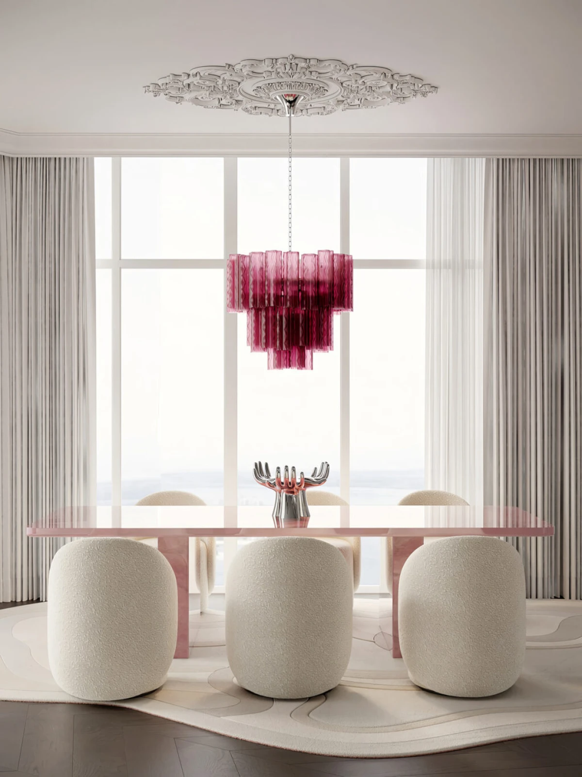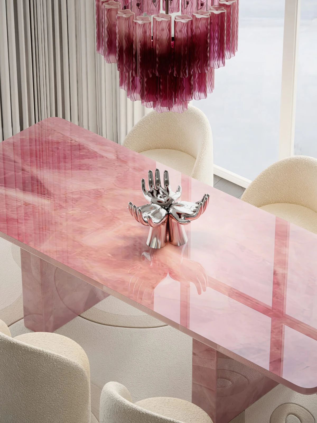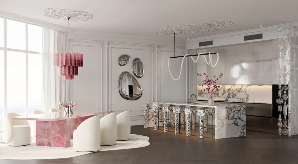 فقط چند قدم دورتر، فضای ناهارخوری به عنوان یک امتداد طبیعی از فضای نشیمن حس میشود، در حالی که شخصیت متمایز خود را دارد. میز ناهارخوری مرمری صورتی شبیه به شیشه، بلافاصله توجه را به خود جلب میکند. این میز نور را بازتاب میدهد و حسی از ظرافت مدرن را به فضا میبخشد. صندلیهای مخملی و کرمرنگ با فرمهای گرد، فضای اطراف میز را ملایمتر کردهاند. بالای میز، یک لوستر خیرهکننده به رنگ سرخابی، حالتی بازیگوشانه و در عین حال لوکس به فضا میافزاید. یک قطعه مرکزی مجسمهگونه روی میز، این ایده را تقویت میکند که در اینجا، حتی کوچکترین جزئیات نیز به عنوان یک اثر هنری طراحی شدهاند.