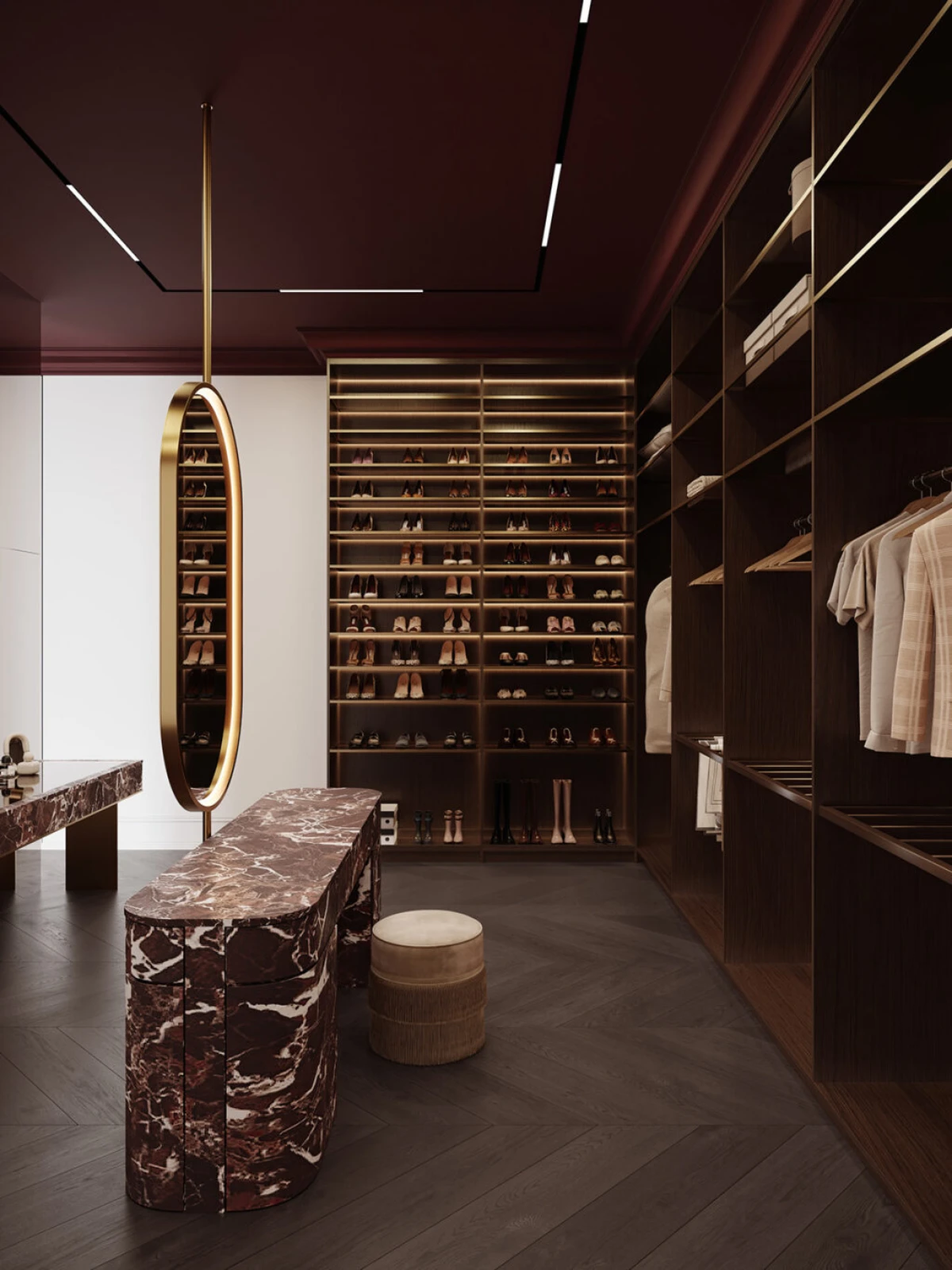 کلوزت (کمد دیواری)، ویترینی از تجمل و ظرافت است. قفسههای بلند تا سقف با جزئیات طلایی، نمایش منظمی برای لباس و اکسسوریها ایجاد کردهاند. در مرکز، یک جزیره مرمری براق به رنگ زرشکی، هم فضای نگهداری فراهم میکند و هم به عنوان یک نقطه کانونی جسورانه عمل میکند. یک آینه بیضیشکل مجسمهگونه و نورپردازی چندلایه، این فضا را تکمیل میکنند.