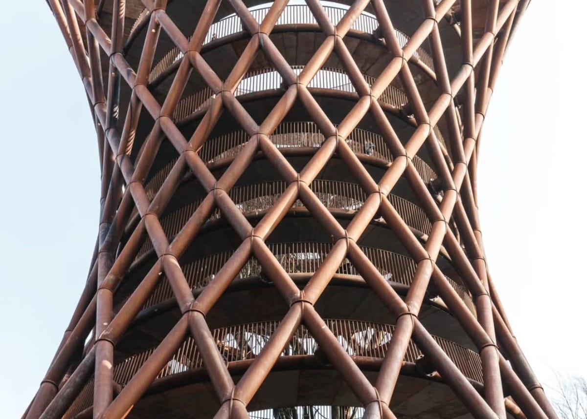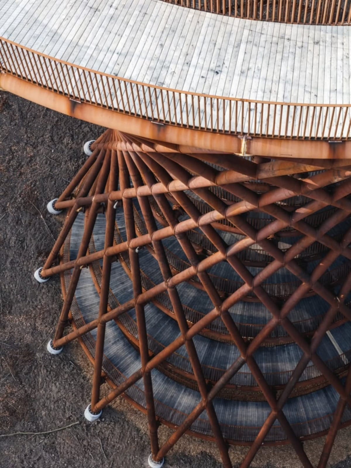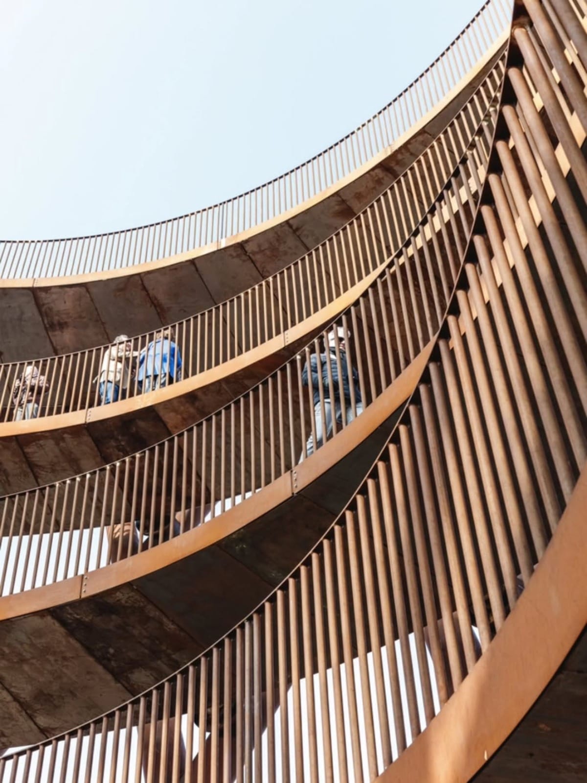 نقطه اوج این تجربه، برج و سکوی دیدبانی است که در ارتفاع ۴۵ متری از سطح زمین قرار دارد. هندسه برج بهگونهای طراحی شده که کیفیت تجربه بازدیدکننده را ارتقا دهد؛ با پرهیز از فرم استوانهای متعارف و جایگزینی آن با فرمی منحنی که کمر باریک و پایه و تاج پهنتر دارد و …