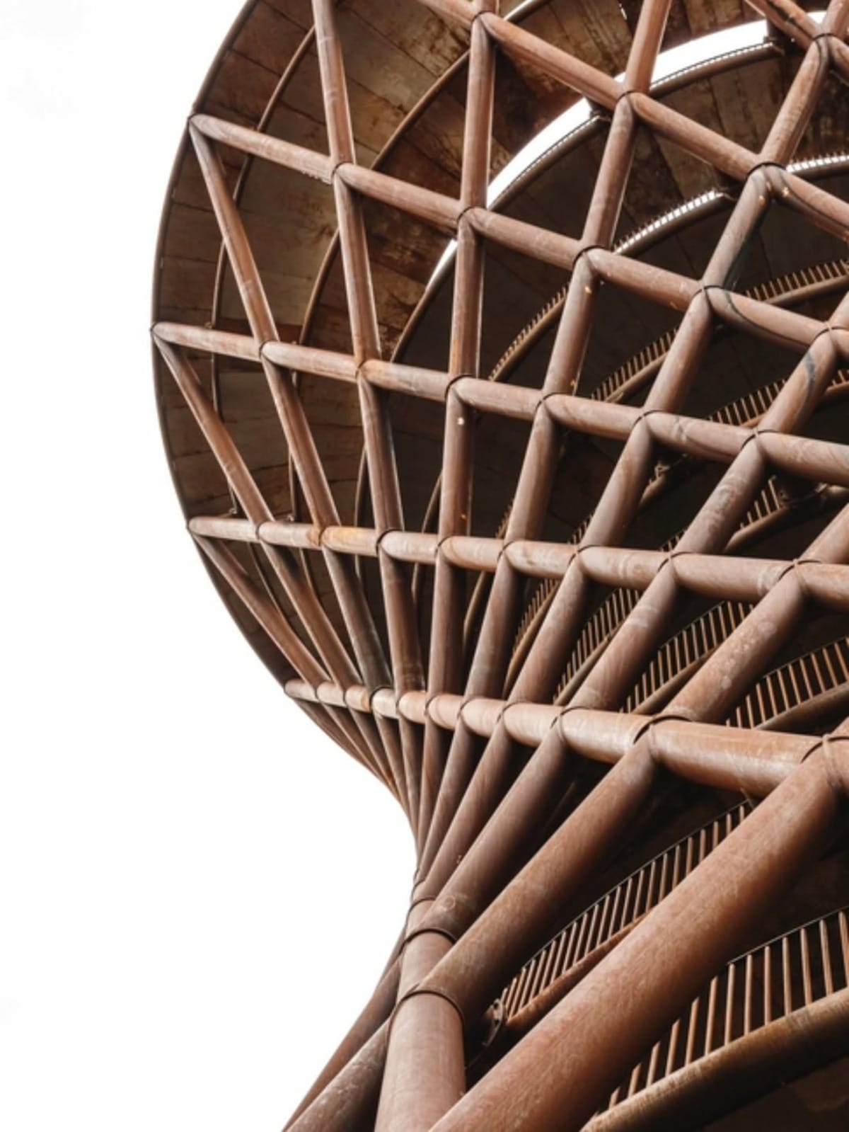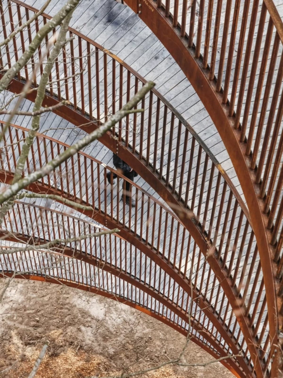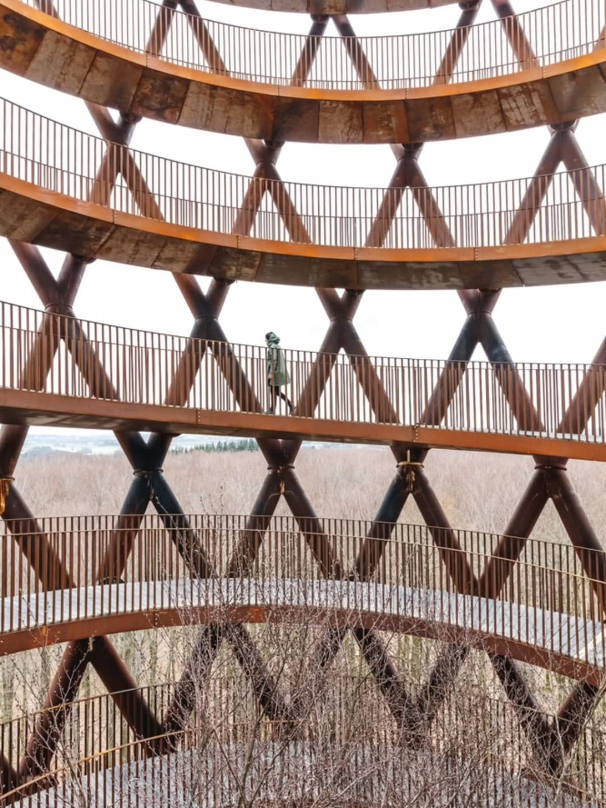 نقطه اوج این تجربه، برج و سکوی دیدبانی است که در ارتفاع ۴۵ متری از سطح زمین قرار دارد. هندسه برج بهگونهای طراحی شده که کیفیت تجربه بازدیدکننده را ارتقا دهد؛ با پرهیز از فرم استوانهای متعارف و جایگزینی آن با فرمی منحنی که کمر باریک و پایه و تاج پهنتر دارد و …