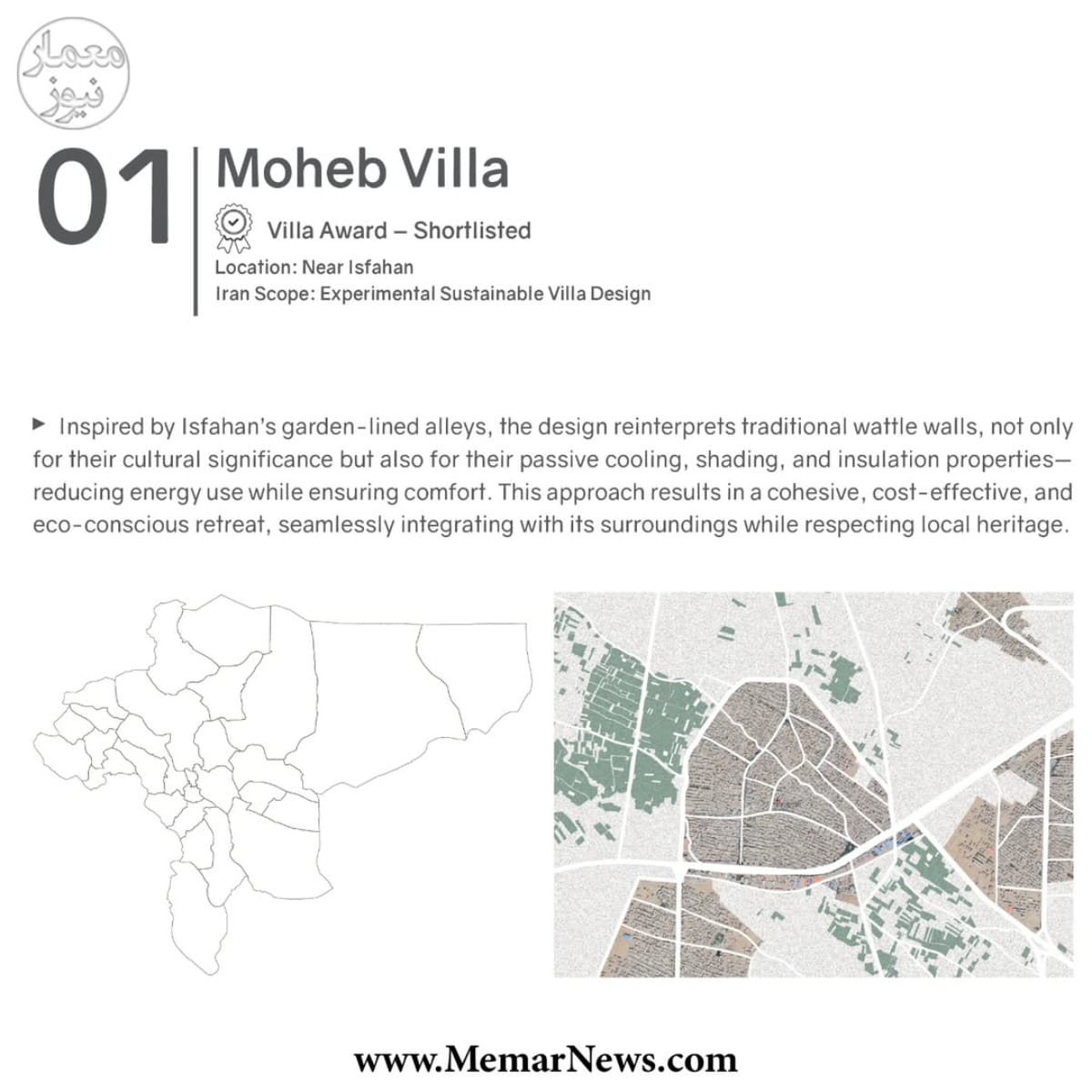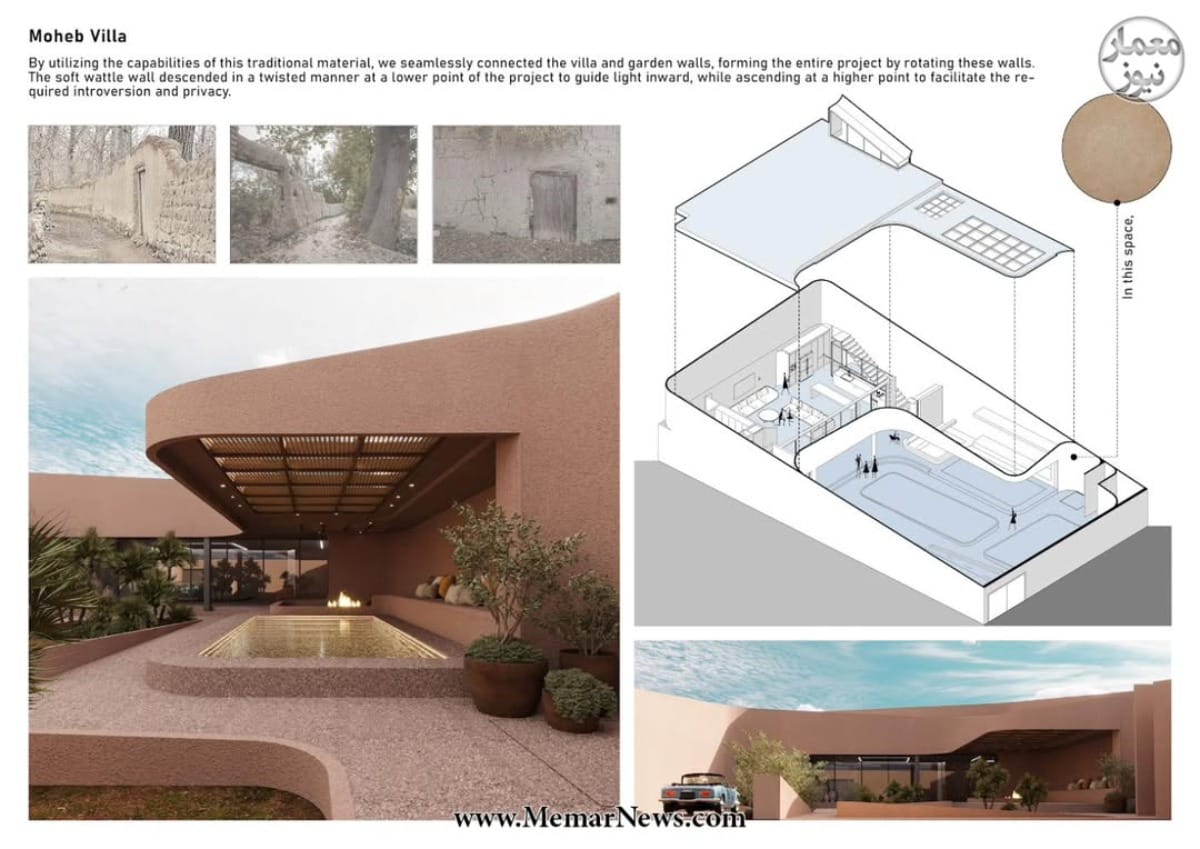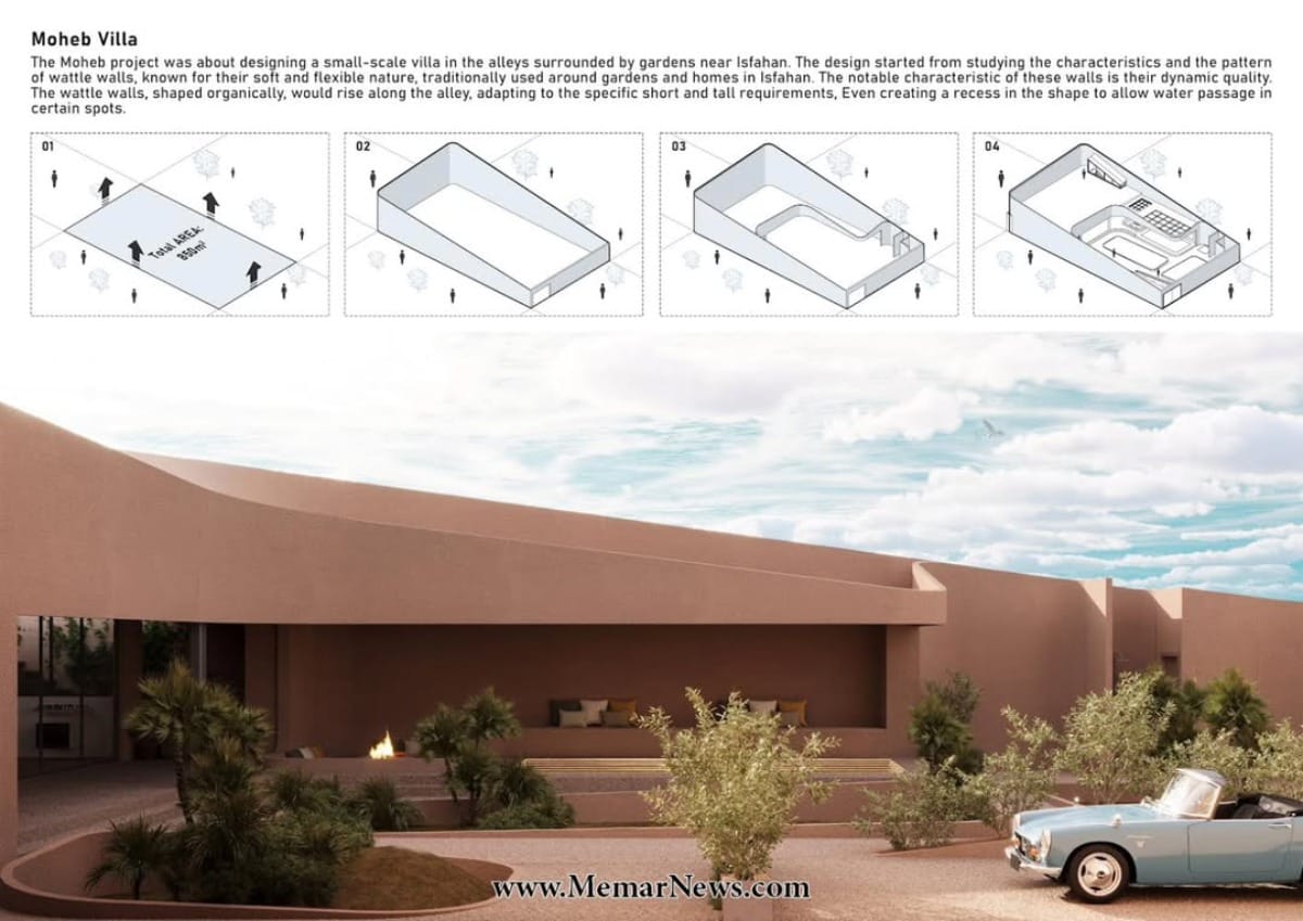 موضوع پروژه محب طراحى يك ويلاى كوچك مقياس در كوچه باغ هاى اطراف اصفهان بود. در طراحى آن از الگوى ديوارهاى كاهگلى كمك گرفتيم . ديوارهاى كاهگلى ، ديوارهاى نرم و منعطفى هستند كه به شكل سنتى اطراف باغ ها و خانه در اصفهان كشيده ميشدند و از صفات برجسته اين ديوارها پويايي آن ها هست . به نحوى كه اين ديوار با فرم هاى ارگانيك و پويا در طول كوچه بسته به نياز كوتاه و بلند ميشوند حتى در جايي حفره اى در شان ايجاد ميشود تا مسيرى براى عبور آب باز كنند . ما با استفاده از ظرفيت هاى اين متريال سنتى جداره هاى ويلا و باغ را بصورت يكدست به هم پيوند داديم و با چرخاندن اين ديوارها كل ويلا را ايجاد نموديم . ديوار كاهگلى نرم به دور پروژه پيچيد در جايي پايين آمد تا نور را به درون هدايت كند و در جايي بالا رفت تا پرابوسى و درون گرايي مورد نياز را تامين كند.