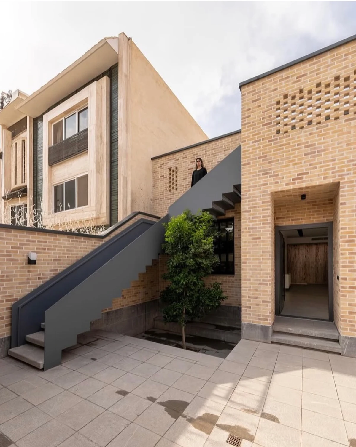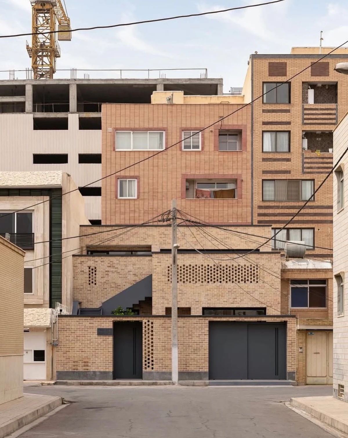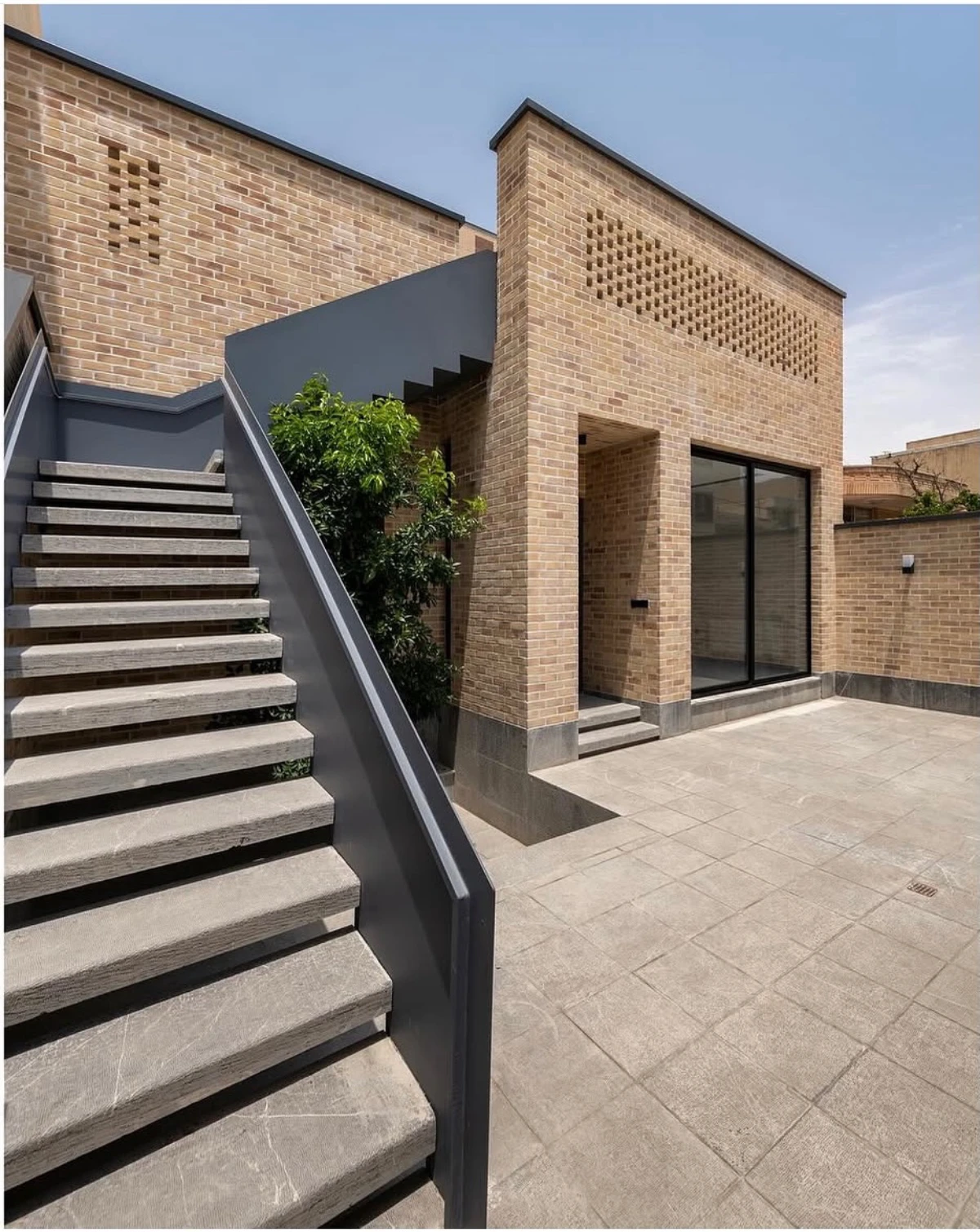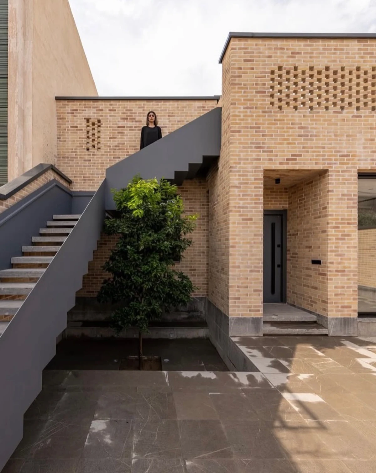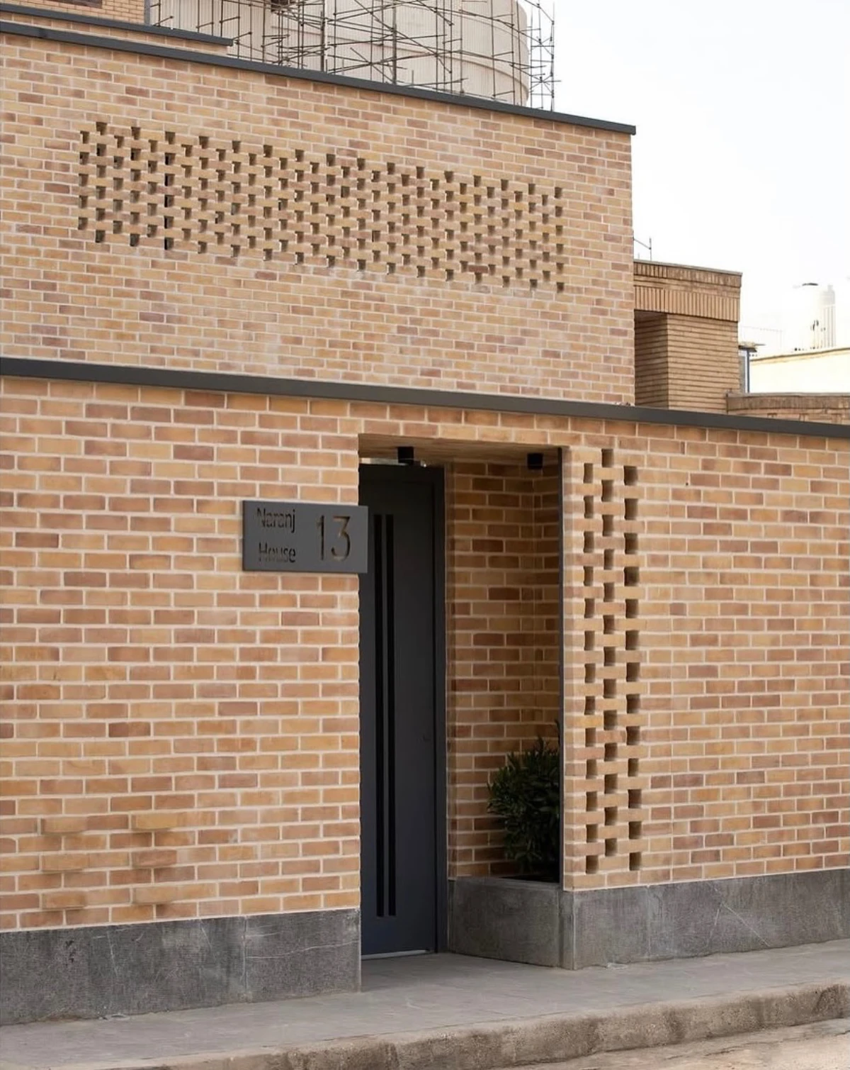 حجمی آجرپوش که دیوارهایش با بافتى زبر و جزئياتى ساده، حريمى آرام اما قاطع براى درون و بيرون، مى سازد.