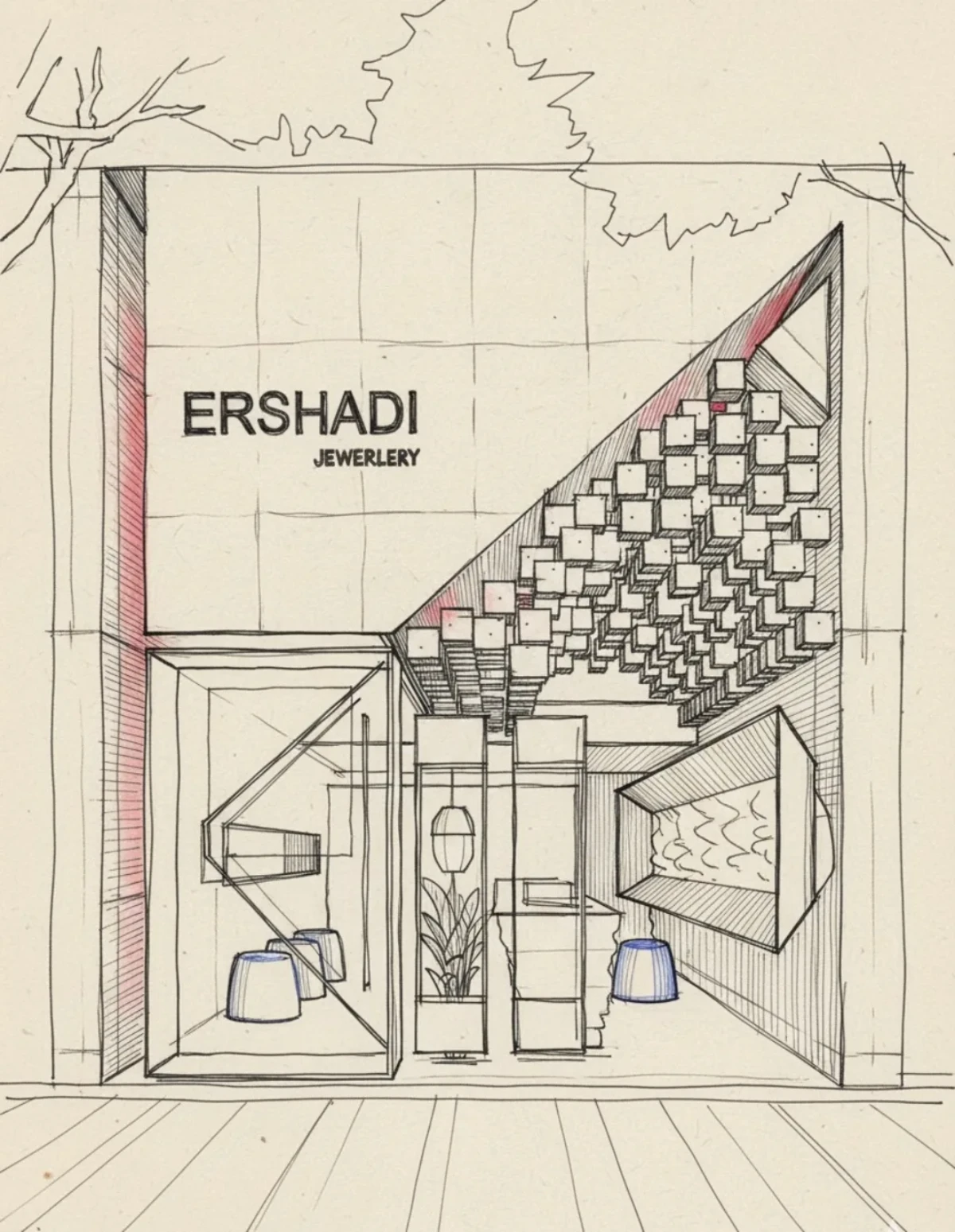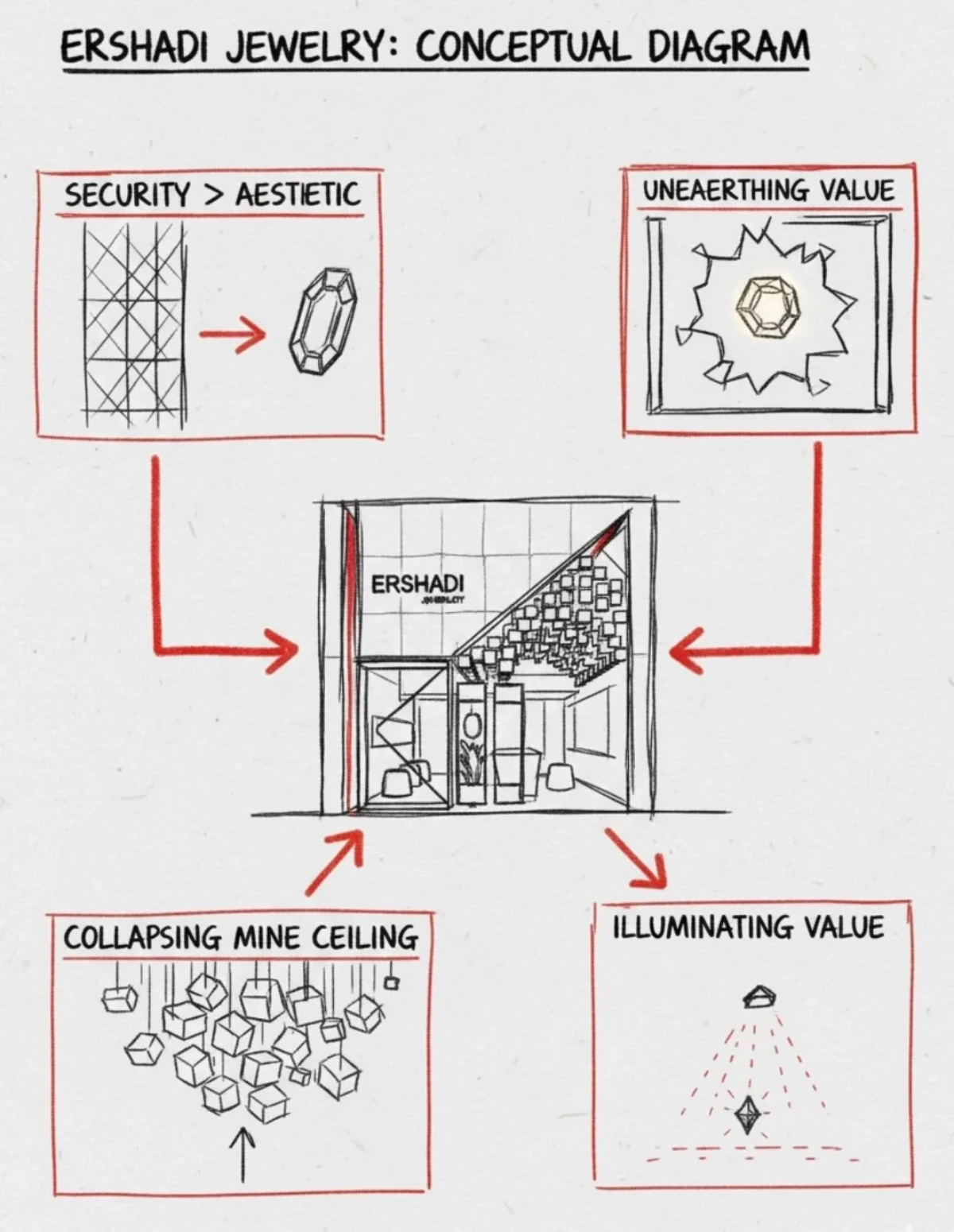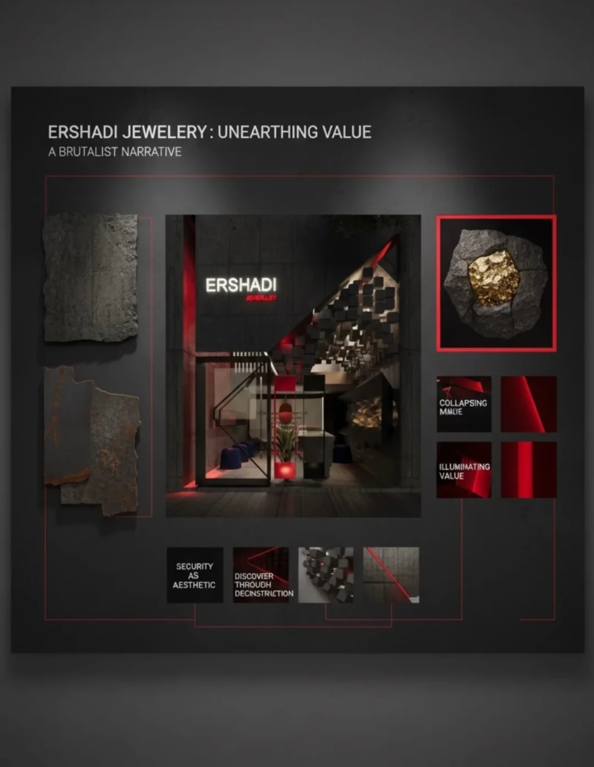 این پروژه تصور کلیشهای طلافروشیها را به چالش میکشد فضایی بینقص، براق و اغراقشده. در عوض رویکردی خام و ناتمام را میپذیرد تا ارزش در دل نقص معنا یابد.