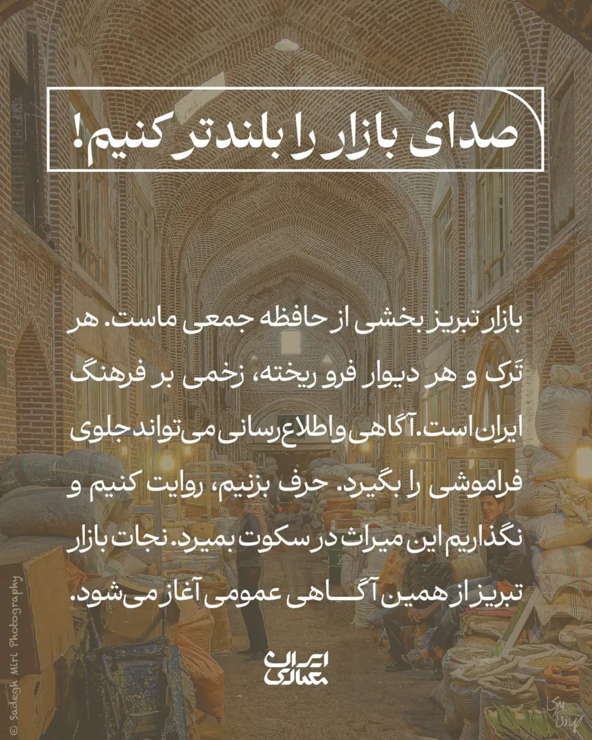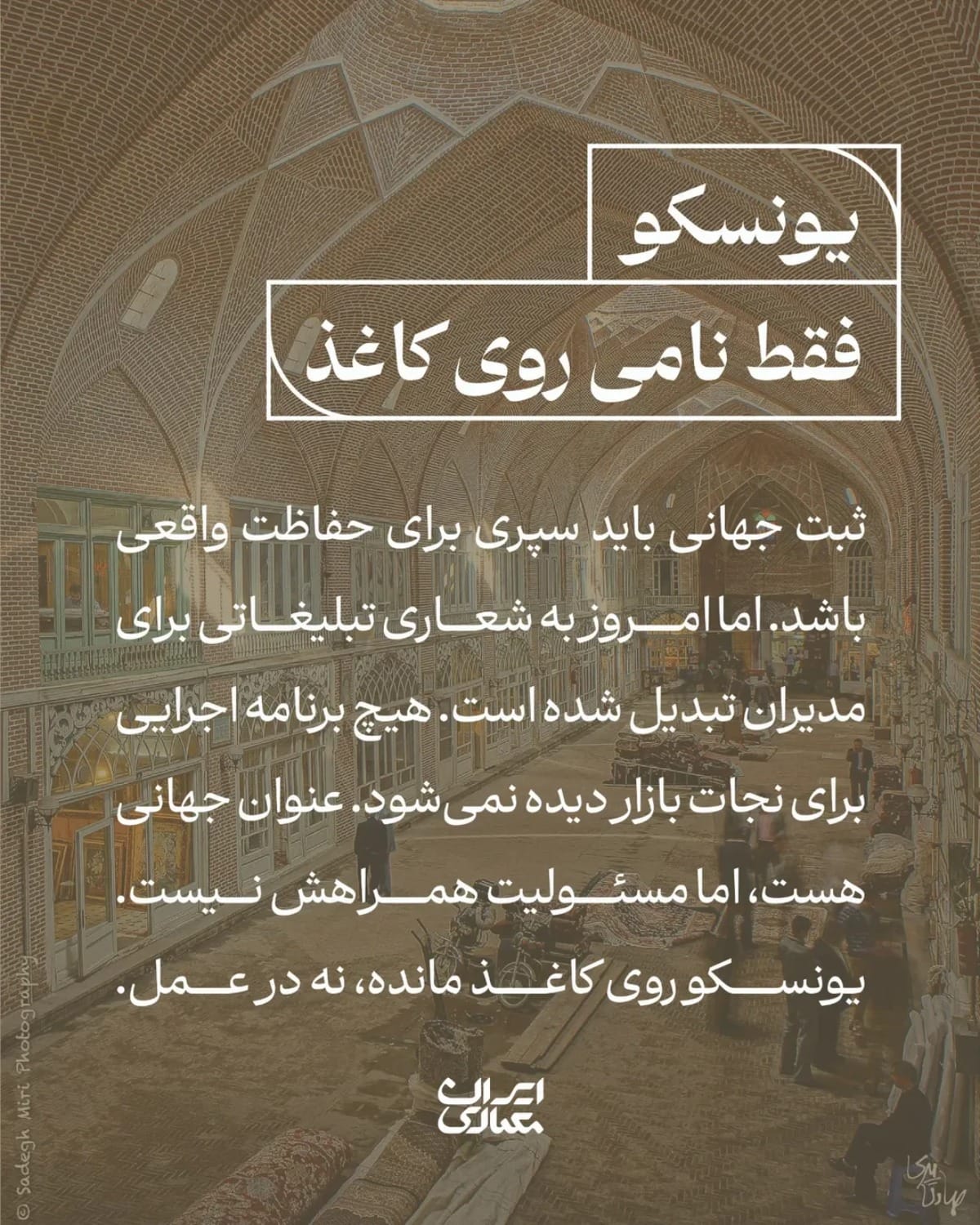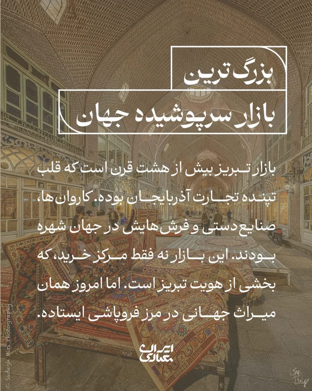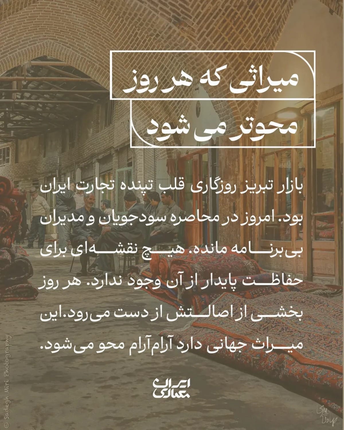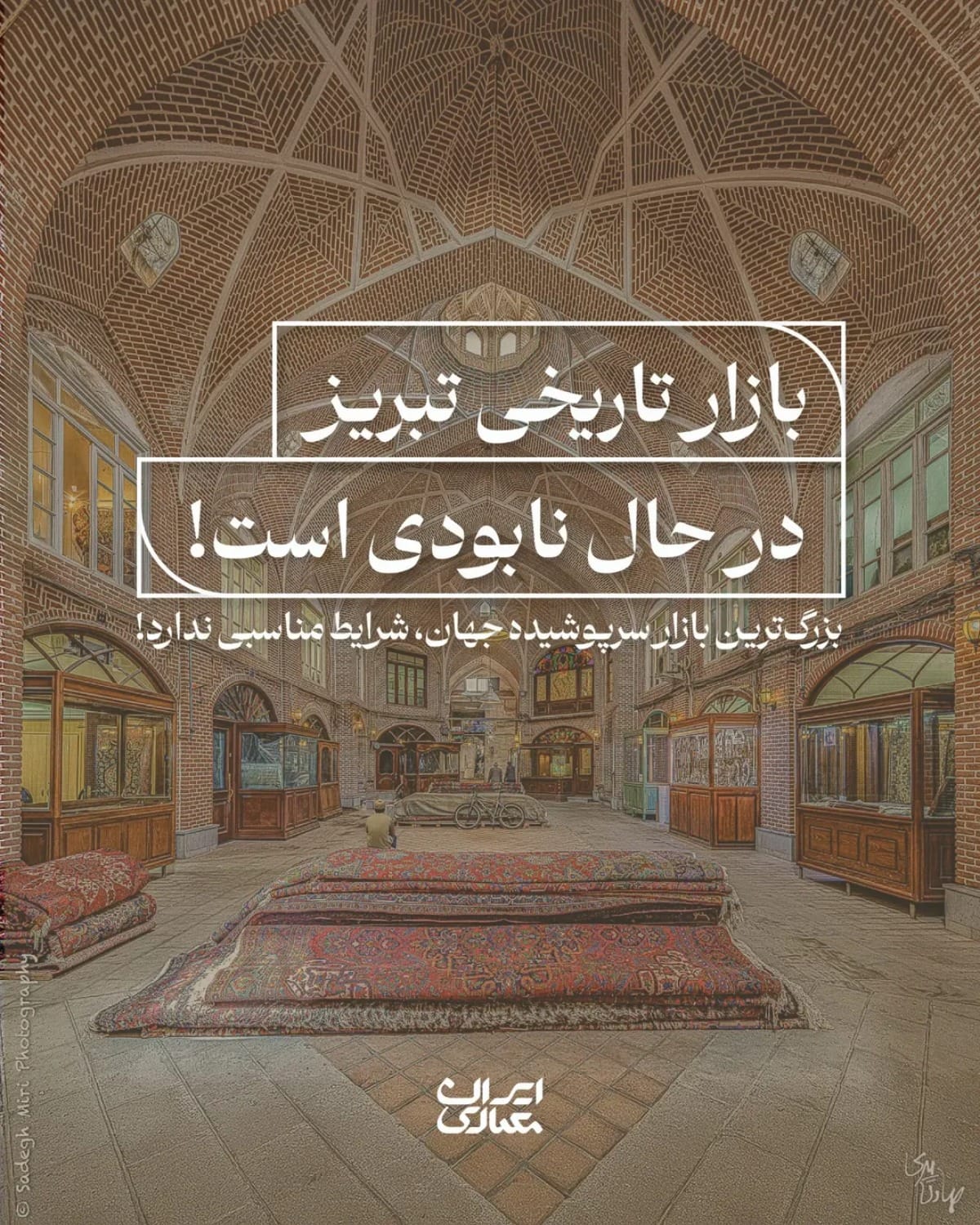 بازار تاریخی تبریز، بزرگترین بازار سرپوشیده جهان، بیش از هشت قرن است که قلب تپنده تجارت و زندگی شهری آذربایجان بوده است. کاروانها، صنایعدستی، فرشهای تبریز و شور زندگی در راستههایش جریان داشت و نامش بهعنوان میراث جهانی یونسکو ثبت شد. اما امروز این شاهکار معماری و فرهنگ در حال فروپاشی است. ثبت جهانی که باید سپری برای حفاظت باشد، تنها به یک عنوان تبلیغاتی تبدیل شده است.
