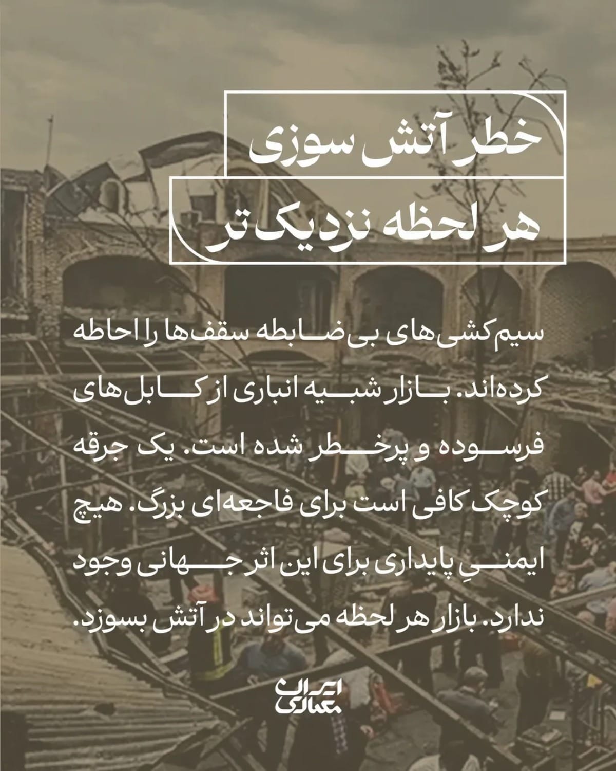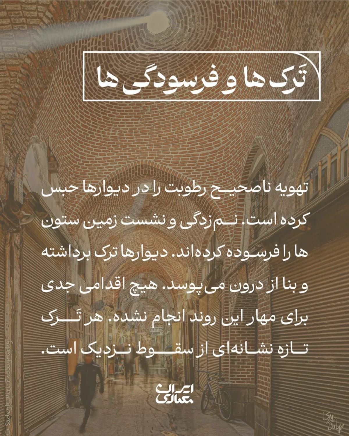 در دل بازار، سیمکشیهای بیضابطه مثل زخمهای باز بر تن آن نشستهاند و هر لحظه خطر آتشسوزی را افزایش میدهند. تهویه نامناسب، نمزدگی و نشست زمین ترکهای عمیق بر دیوارها و ستونها انداخته است.