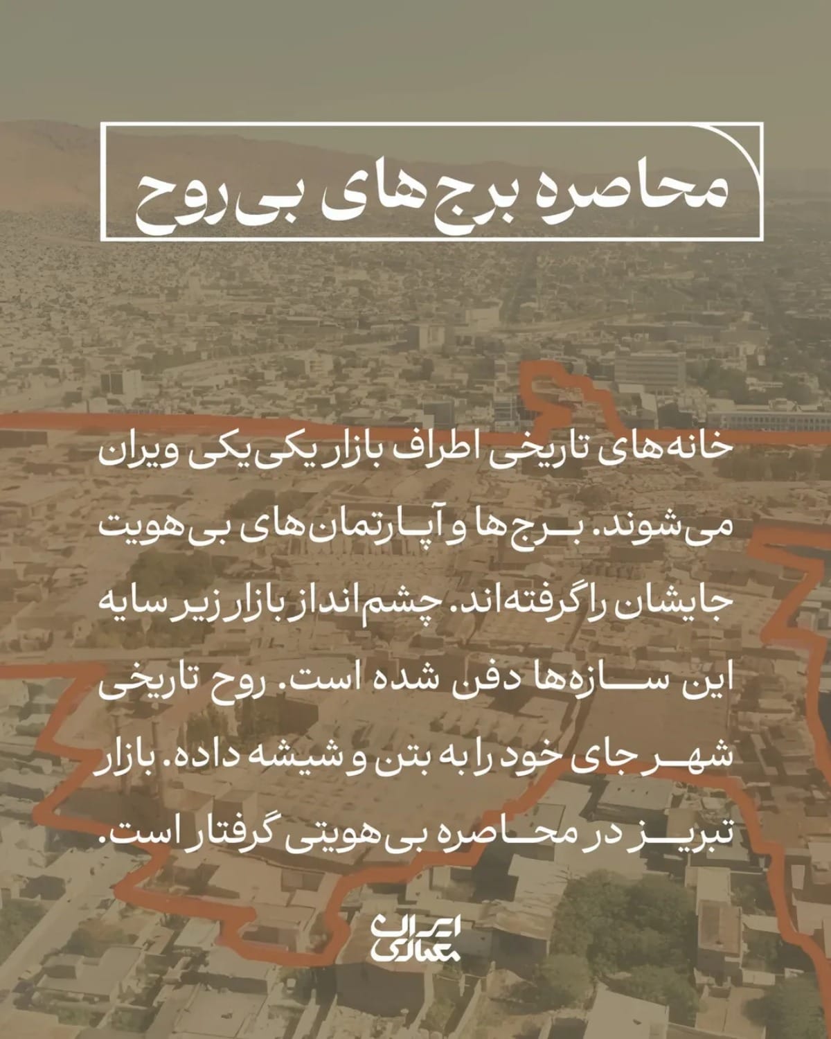 خانههای تاریخی اطراف یکییکی تخریب میشوند و جای خود را به برجها و آپارتمانهای بیروح میدهند. چشمانداز بازار در میان این سازههای بیهویت دفن شده است.