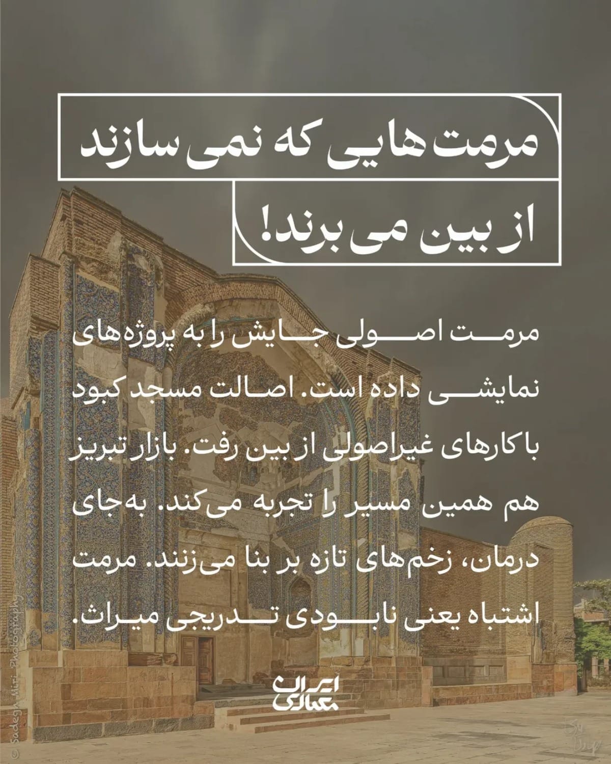 مرمتهای غیراصولی نیز ضربهای دیگر بر پیکر میراث تبریز زدهاند؛ اصالت مسجد کبود نمونهای روشن از این بیتوجهی است. بازار تبریز، روزگاری قلب تجارت ایران، اکنون در محاصره سودجویان و مدیران بیبرنامه جان میدهد. یونسکو فقط نامی روی کاغذ است، در حالی که اصالت بازار هر روز بیشتر از دیروز محو میشود. پروژههای نمایشی جای حفاظت واقعی را گرفتهاند و آیندهای برای این میراث دیده نمیشود. هر ترک تازه، هر سقف نمزده و هر دیوار فروریخته نشانه نزدیکتر شدن به پایان است. بازاری که باید میراث زنده ایران باشد، آرامآرام به خاطرهای خاموش در کتابهای تاریخ بدل میشود.
