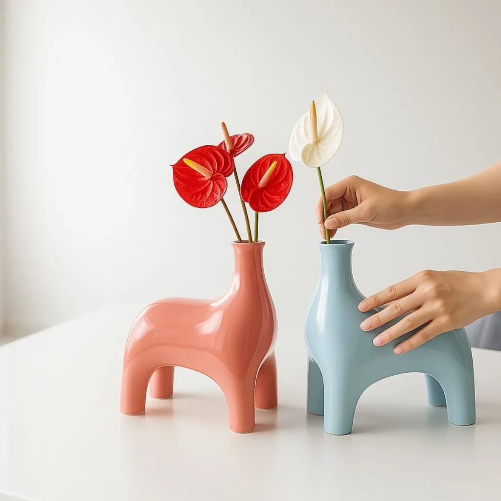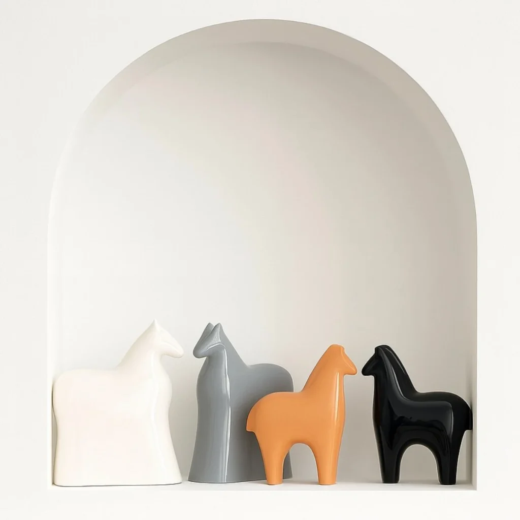 مجسمههای دكوراتيو مینیمال سراميكي با الهام از فرم اسب، با لعاب براق و رنگهای خنثی. طراحیشده برای دکور فضاهای ساده و مدرن .